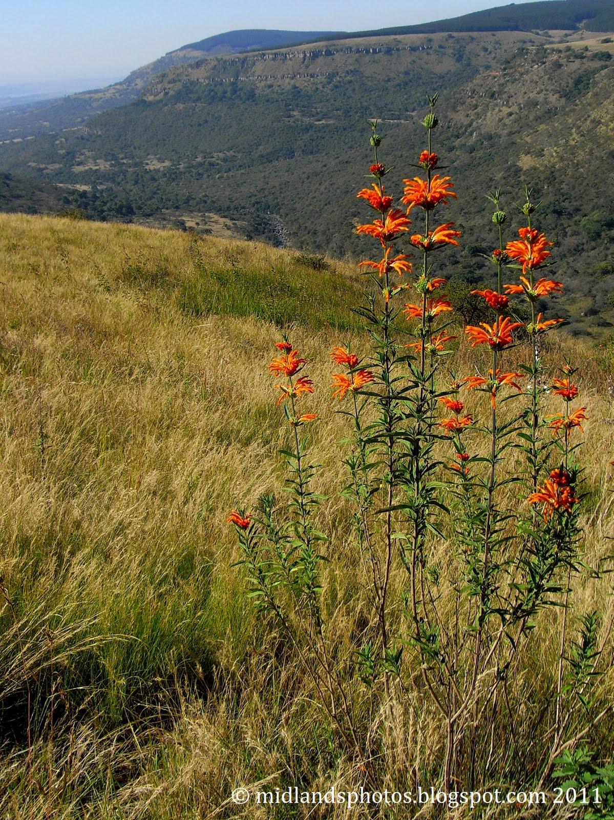Is there something about warm fire coloured blossoms that makes them such prolific winter flowering plants? As the usually green, green hills of Natal take on the golden hues of their frost deadened grasses, the mostly vibrant yellows and oranges of seasonal shrubs now in bloom contrast beautifully against the brown, enlivening many a local landscape. They give a feeling of warmth, not always in keeping with the cool daytime air temperatures, although in fairness I’m finding this, my first winter in the Midlands, delightfully mild. Many of the species flowering presently are aloes (in fact next month Creighton in the south Midlands hosts an aloe festival) but equally prevalent right now are the unmistakable spiky bracts of Leonotis Leonorus commonly known as Wild Dagga (although it has none of the narcotic properties of its cannabis namesake). Popular in domestic gardens, spreads of this plant in nature are easily found.It is almost impossible at the moment to find a flowering Dagga plant not being harvested by honey bees, an obvious subject for a close-up study and a macro lens but with a backdrop as magnificent as the uMngeni Valley looking towards Albert Falls dam, this is the image I have chosen to share.